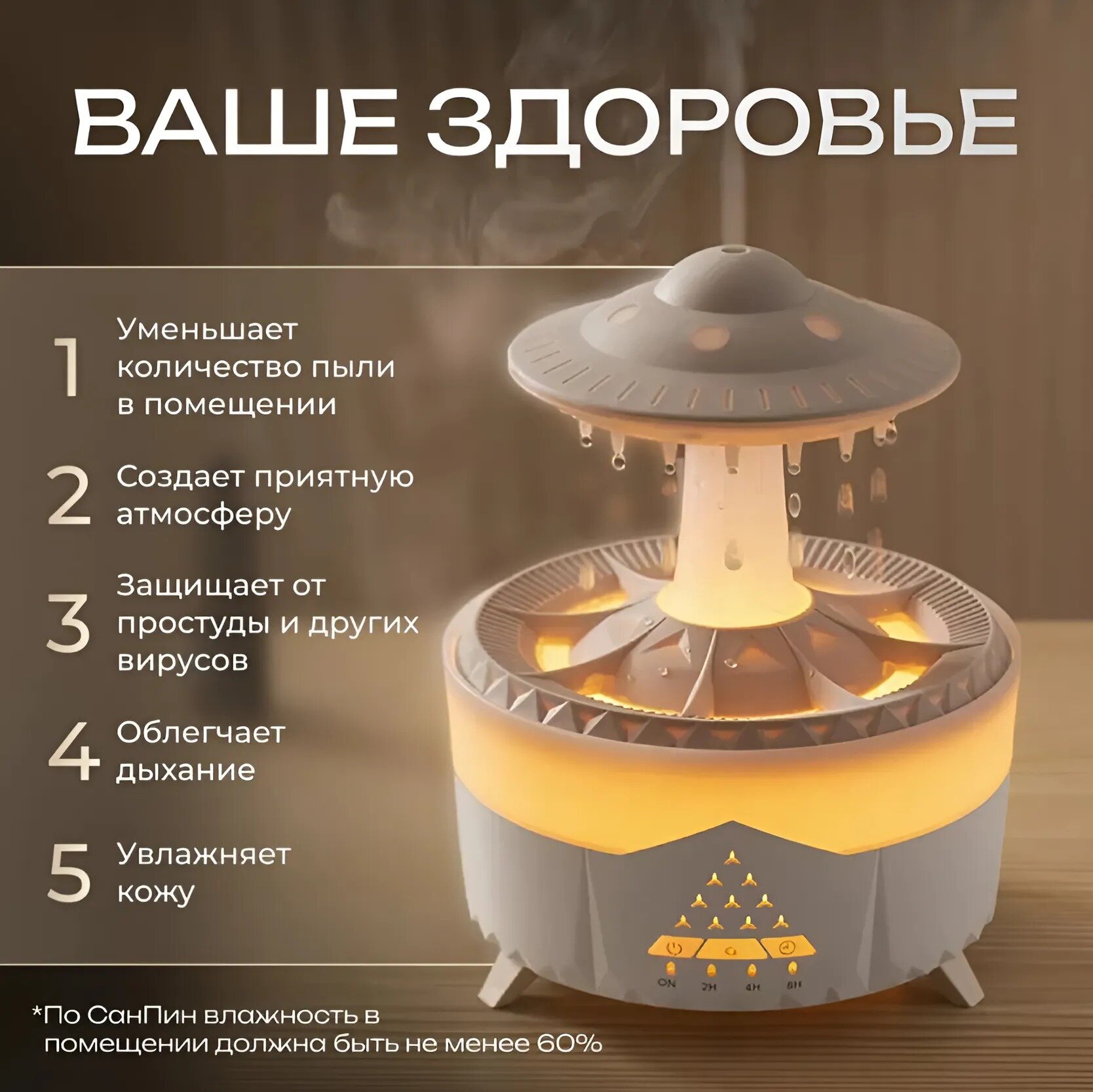 | Особенности | индикация работы / таймер / увлажнение воздуха / ночник / эффект дождя |