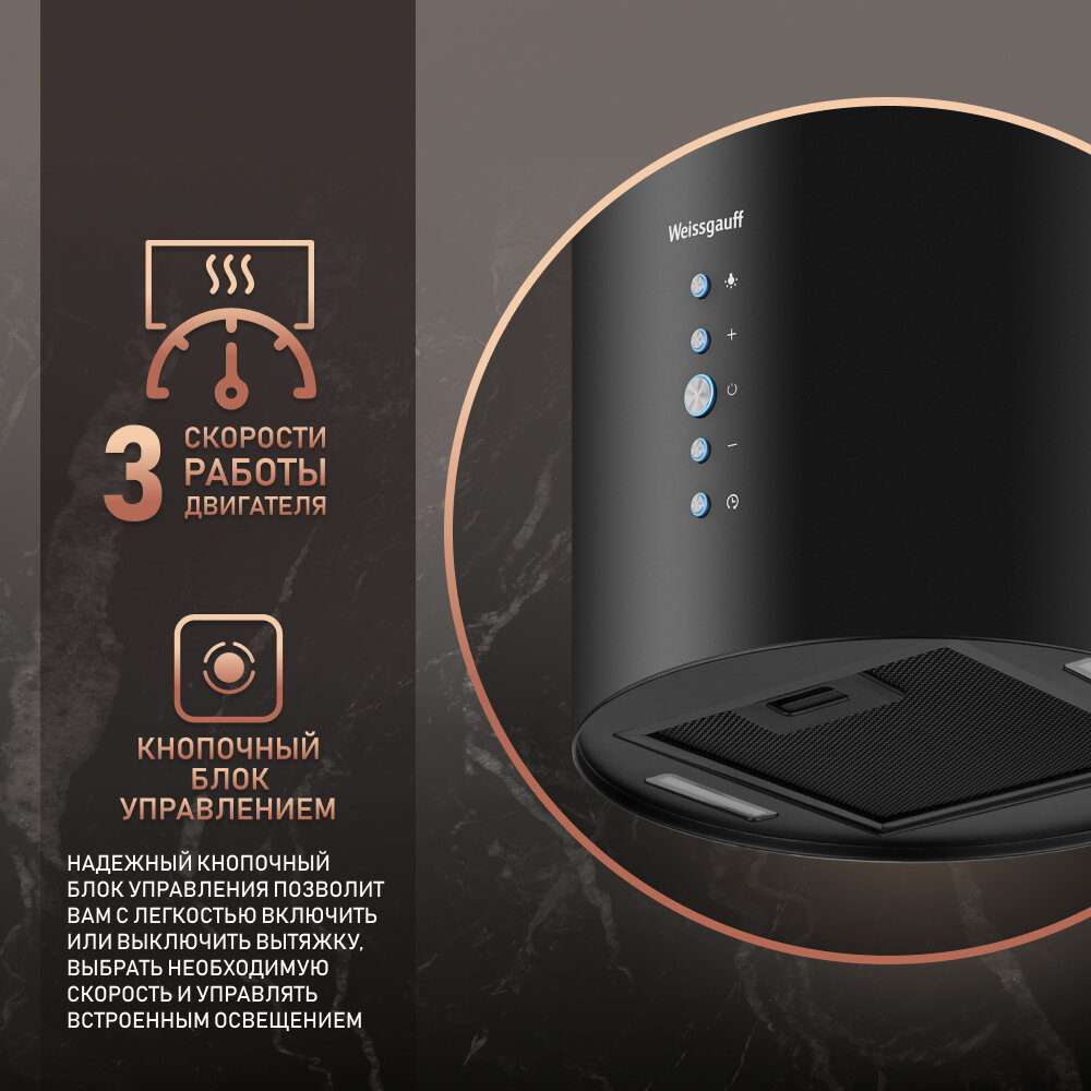 Купольная вытяжка Weissgauff Yota 600 PB BL, производительность 900 м3/ч, уровень шума 50 дБ