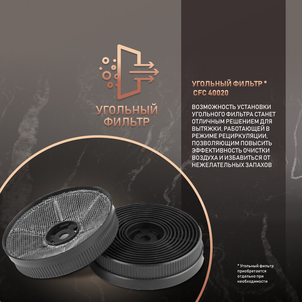 | Дополнительная информация | Эффективная работа в помещении площадью до 27 м2, Низкий уровень шума 42 дБ, Надежный электронный блок управления, Интегрированное освещение, Возможность установки угольного фильтра |