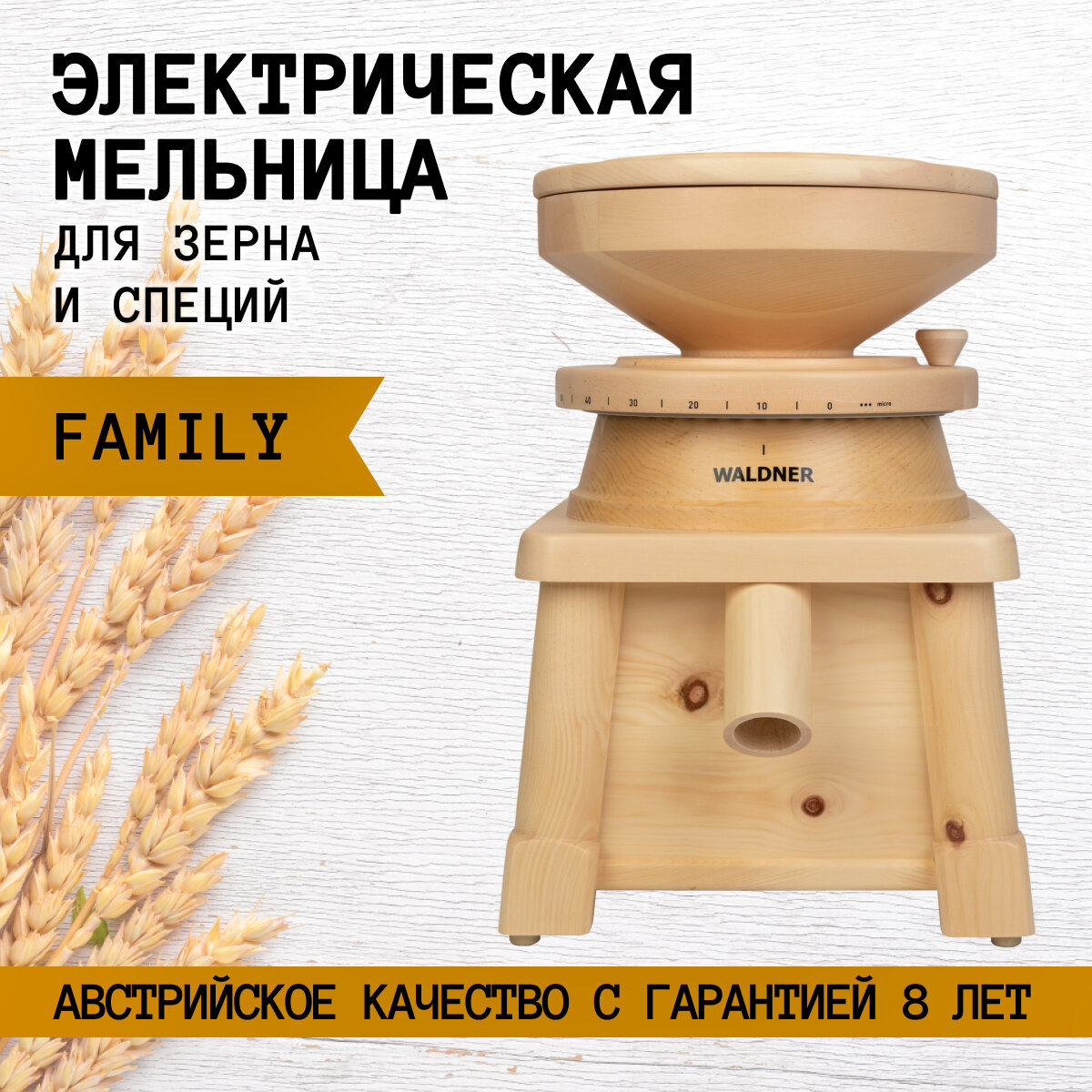 | Дополнительная информация | Мукомолка Waldner Biotech Family (сосна) жерновая электрическая домашняя мини мельница для помола зерна, зерновых в муку |