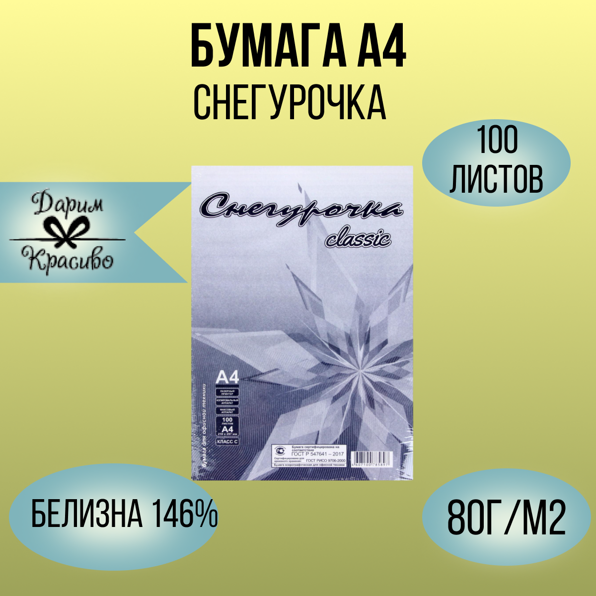 Бумага А4, 100 листов "Снежинка", 80г/м2, белизна 146% CIE, класс С, в т/у плёнке (цена за 100 листов)