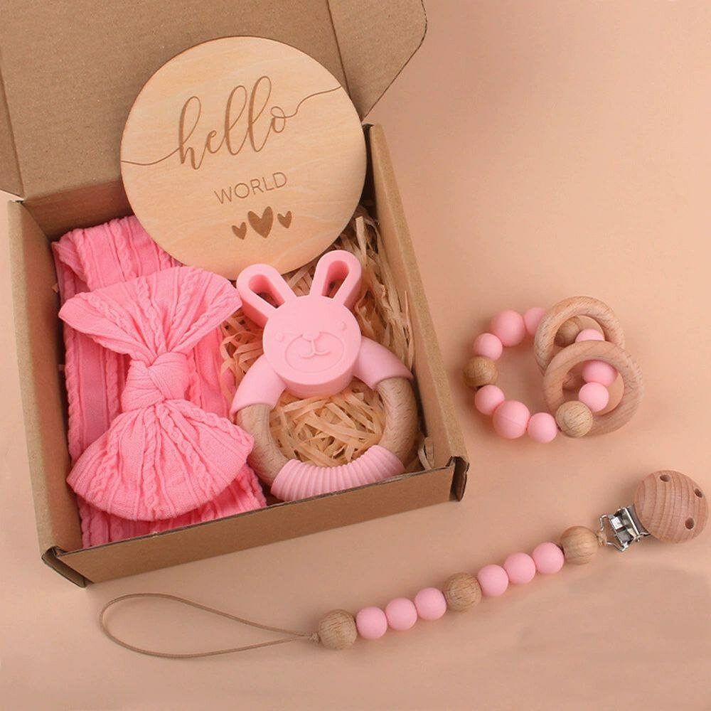 | Комплектация | Повязка на голову, деревянный держатель для соски, прорезыватель деревянный с силиконовым зайчиком, погремушка из деревянных бус и колечек, деревянная табличка "Hello world" |