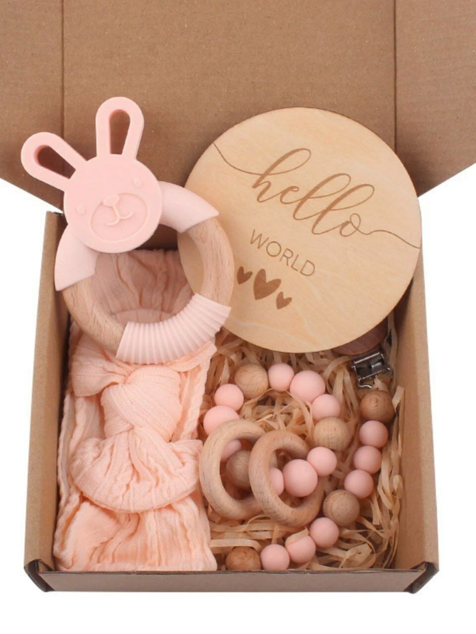 | Комплектация | Повязка на голову, деревянный держатель для соски, прорезыватель деревянный с силиконовым зайчиком, погремушка из деревянных бус и колечек, деревянная табличка "Hello world" |