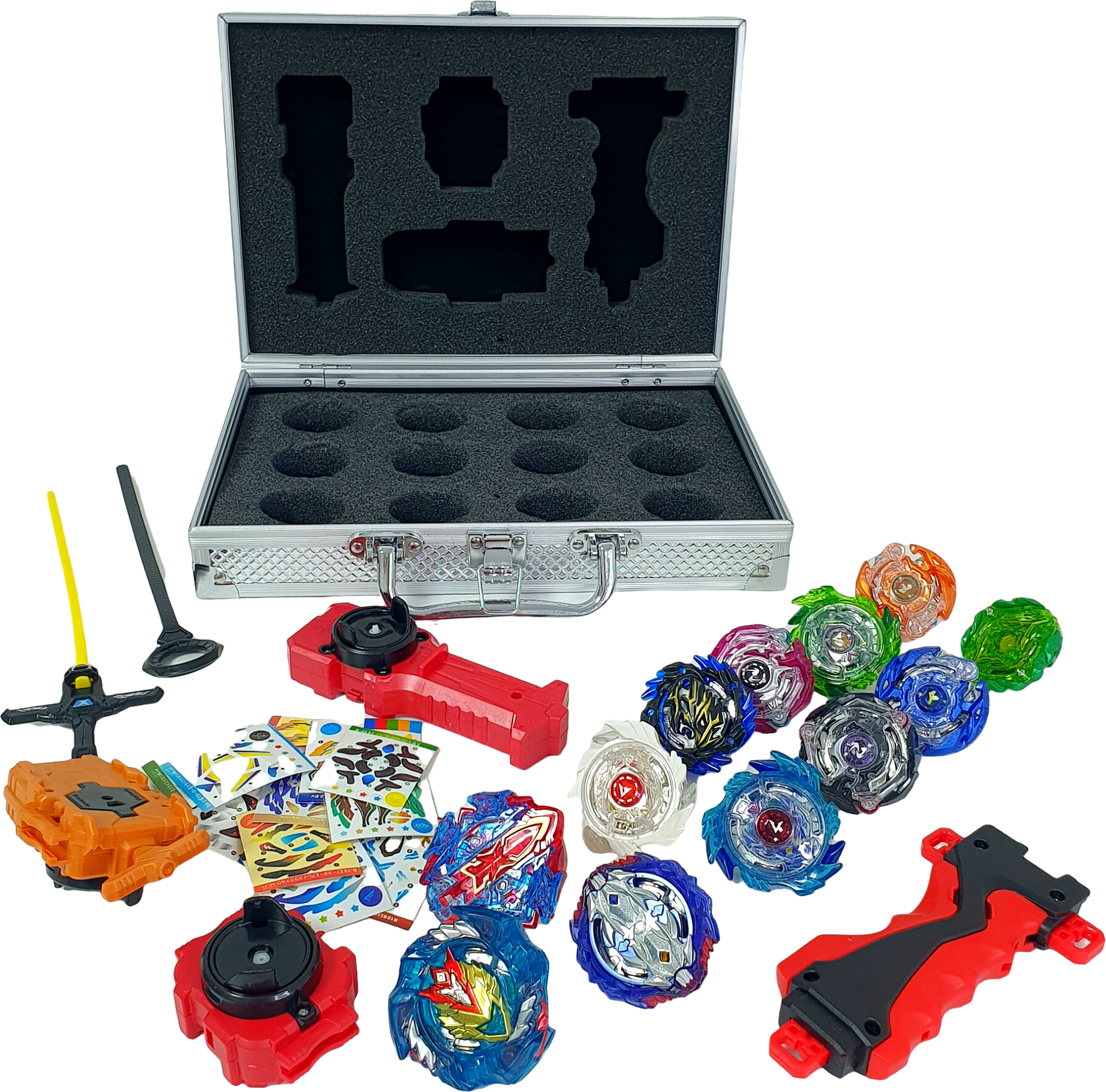 | Комплектация | Металлический кейс - 1 шт. Волчки - 12 шт. Пусковой механизм -3 шт. Держатель - 1 шт. Наклейки -11 шт. |