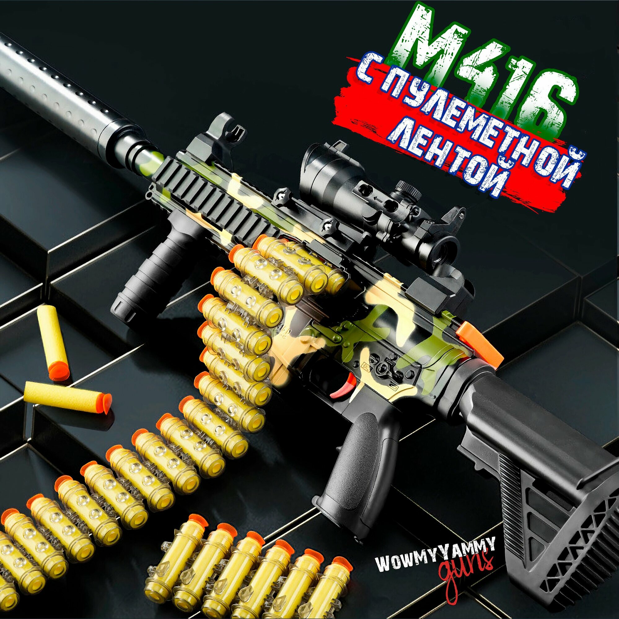 Отзывы на Нерф игрушечный автомат пулемет с мягкими пулями М416.Детское оружие с глушителем и пулеметной лентой. Отличный подарок мальчику! Цвет хаки.
