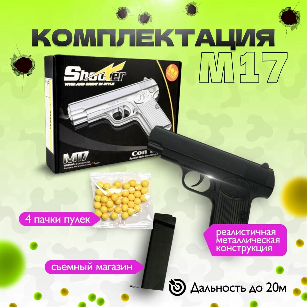 Мы выбрали 10 лучших цен на Пистолет игрушечный M17 металлический, детский пневматический пистолет с пластиковыми пульками. Перед тем как купить Пистолет игрушечный M17 металлический, детский пневматический пистолет с пластиковыми пульками посмотрите найденные предложения из Яндекс Маркета и других сайтов на основе XML фидов.