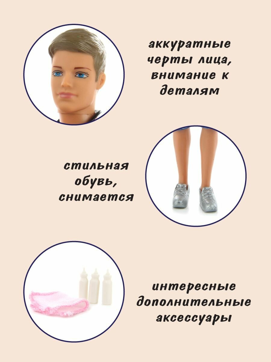 Шарнирная кукла папа Кевин с малышом и коляской, 31 см, Veld Co / Куколка кен для барби с одеждой и аксессуарами для девочки информация: