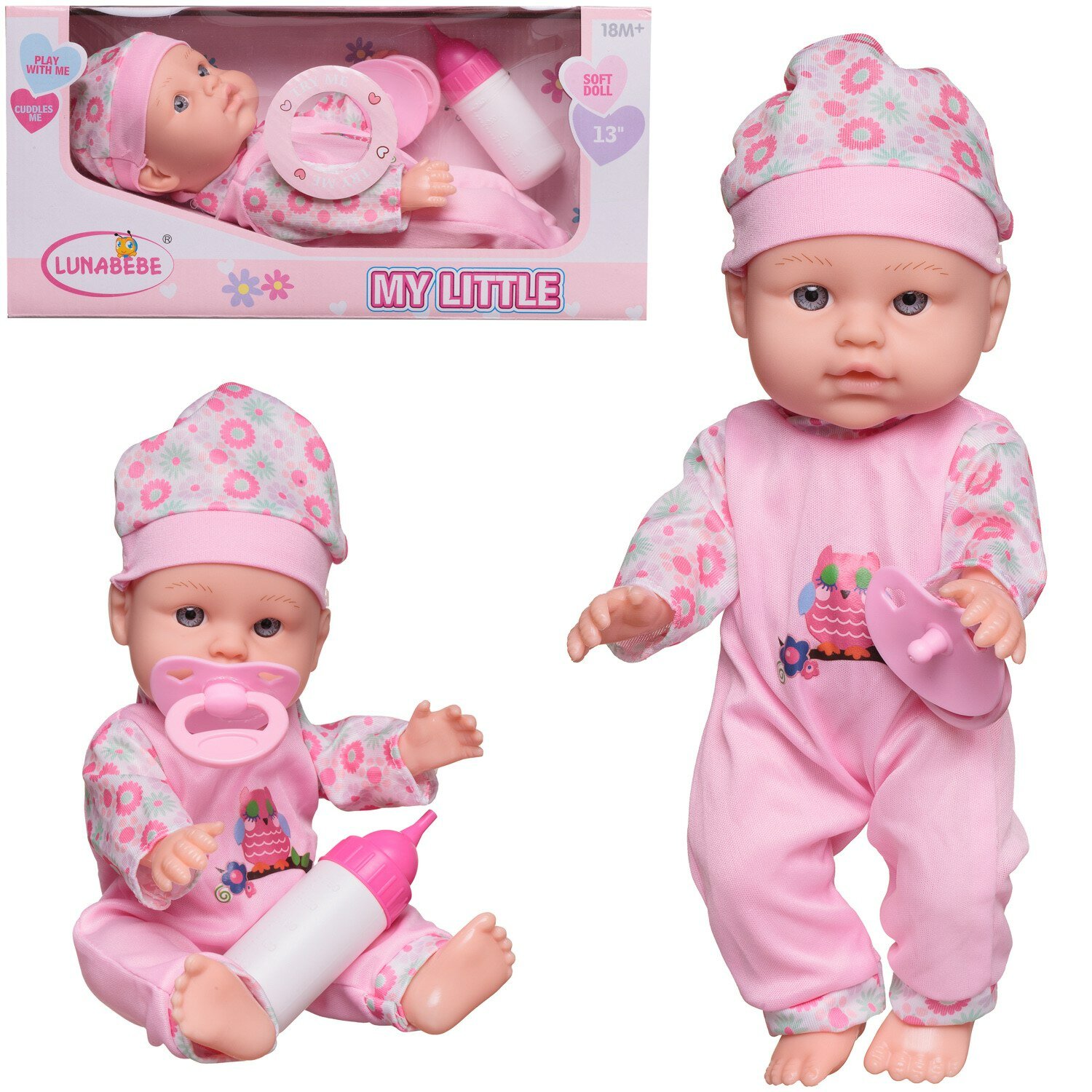 10 цен на Пупс Junfa "My Little", 27 см, озвученный, в розовом комбинезоне с изображением совенка, с бутылочкой и соской, в коробке