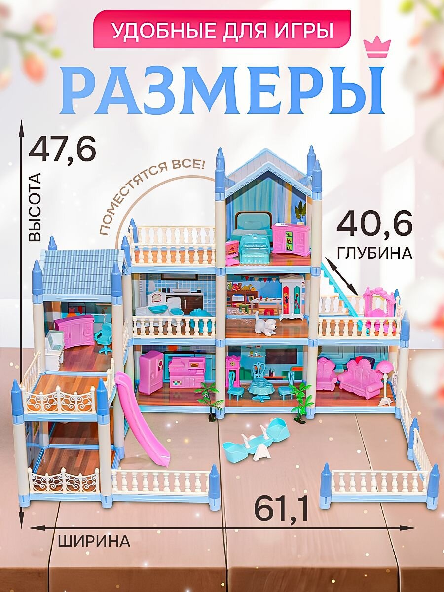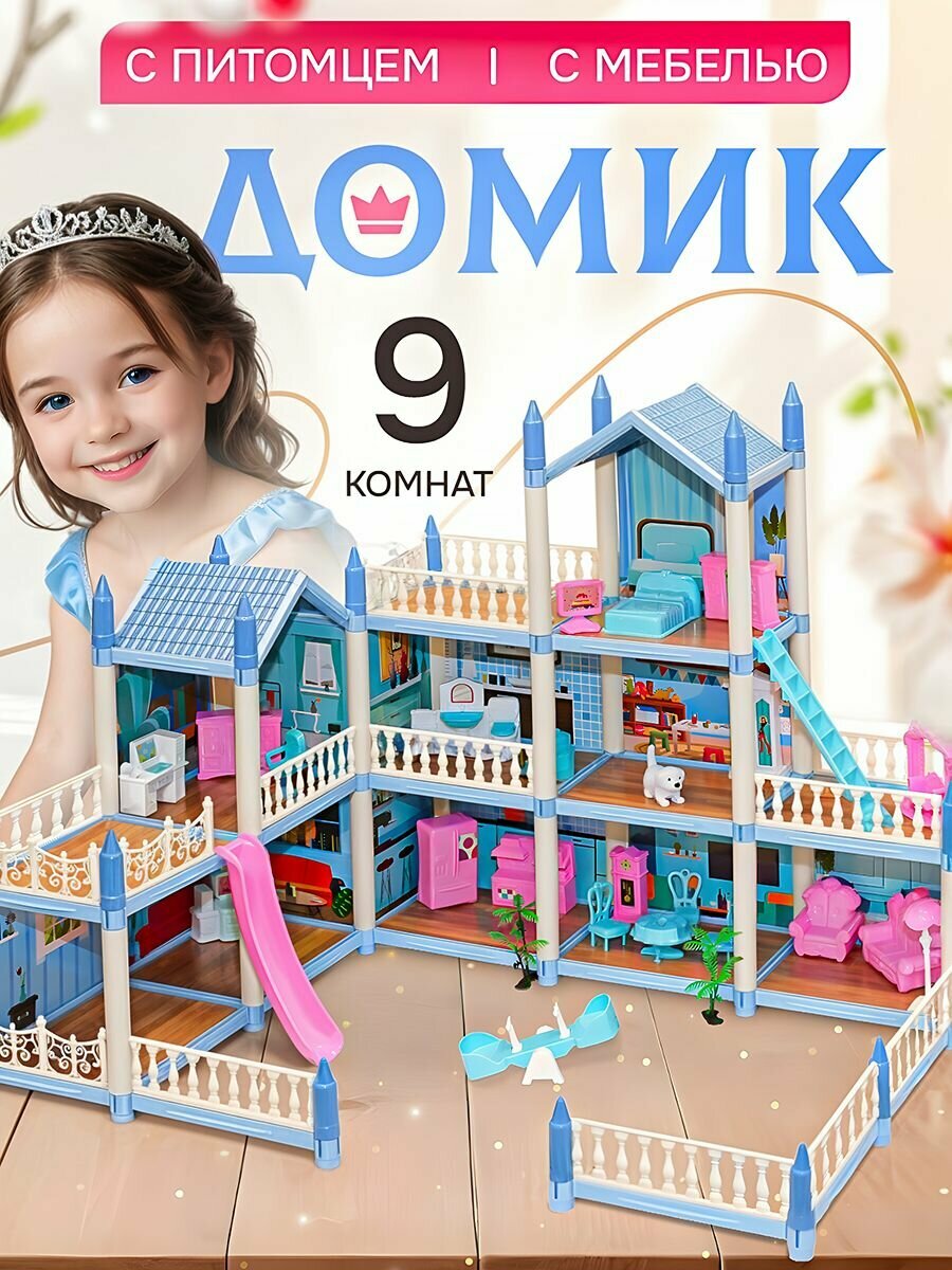 Сборный кукольный домик: 3 этажа, 8 комнат, мебель, аксессуары, питомец информация: