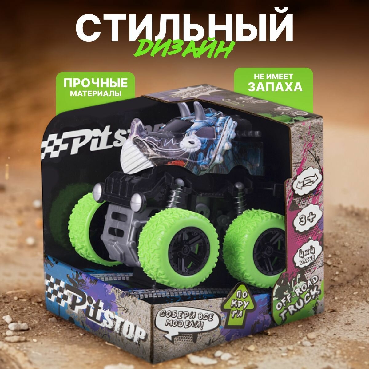 Отзывы на Машинка Инерционная Pit Stop, Трак Граффити Дино с Зелеными колесами, 10 см в Коробке
