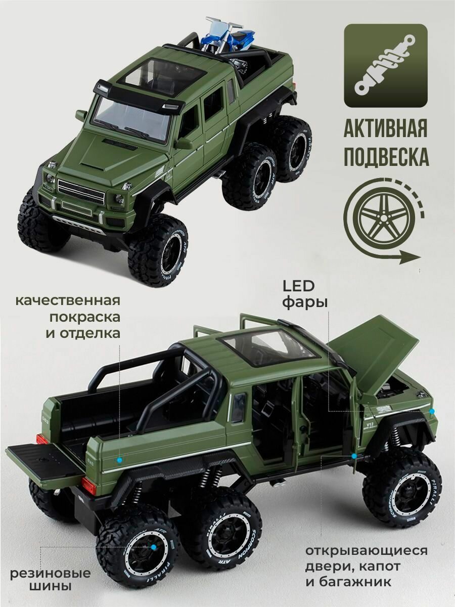 Машинка металлическая WiMi Mercedes Benz AMG-G63 с мотоциклом, 1:28 зеленый, свет, звук информация: