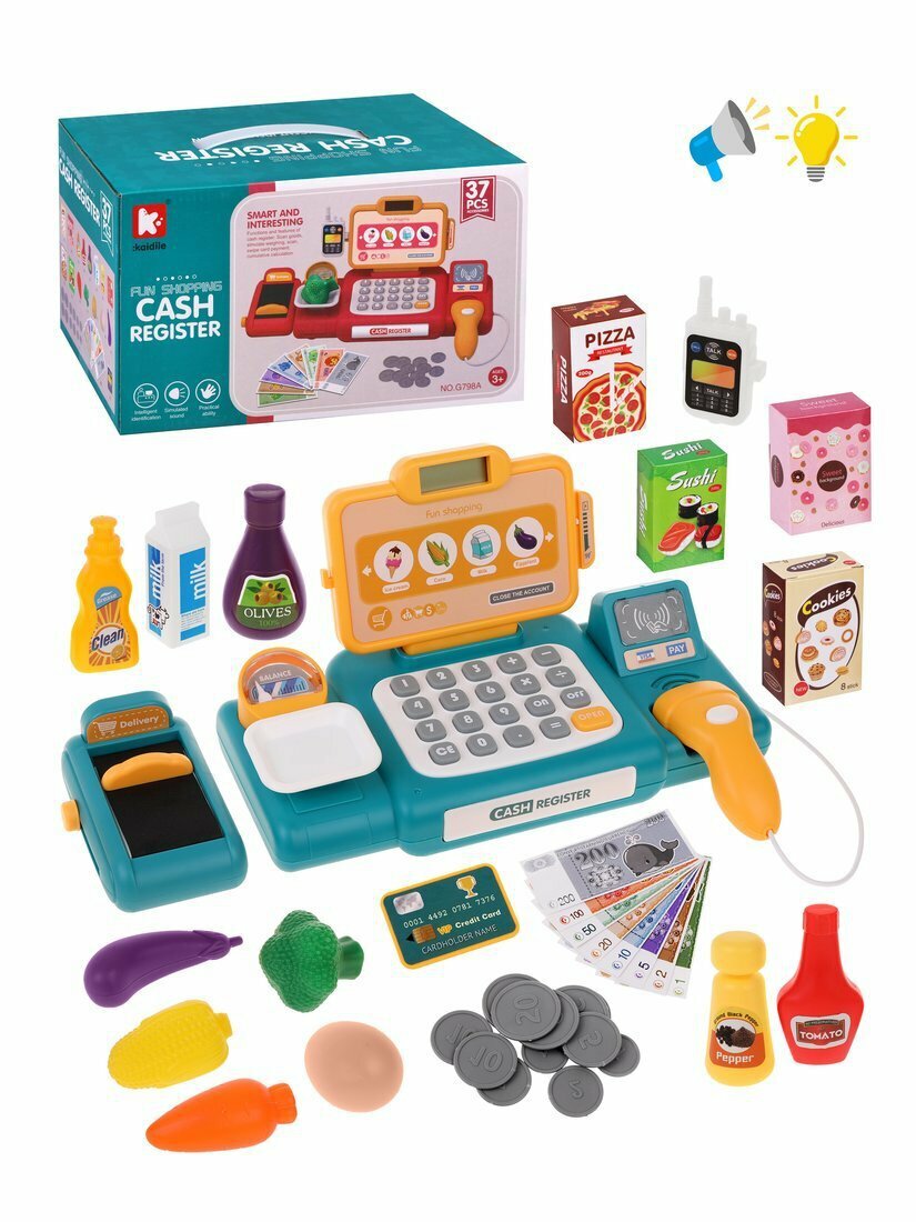 Касса детская игрушечная с калькулятором, сканером и микрофоном, игрушечные деньги и набор игрушечных продуктов в комплекте