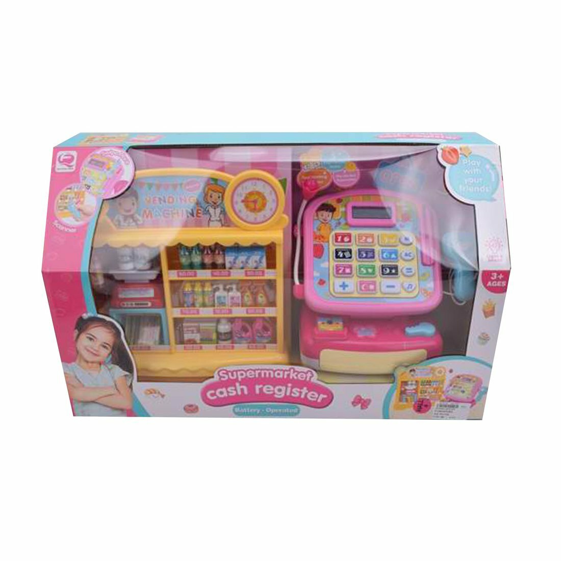 Касса детская игрушечная с калькулятором, сканером и микрофоном, игрушечные деньги и набор игрушечных продуктов в комплекте