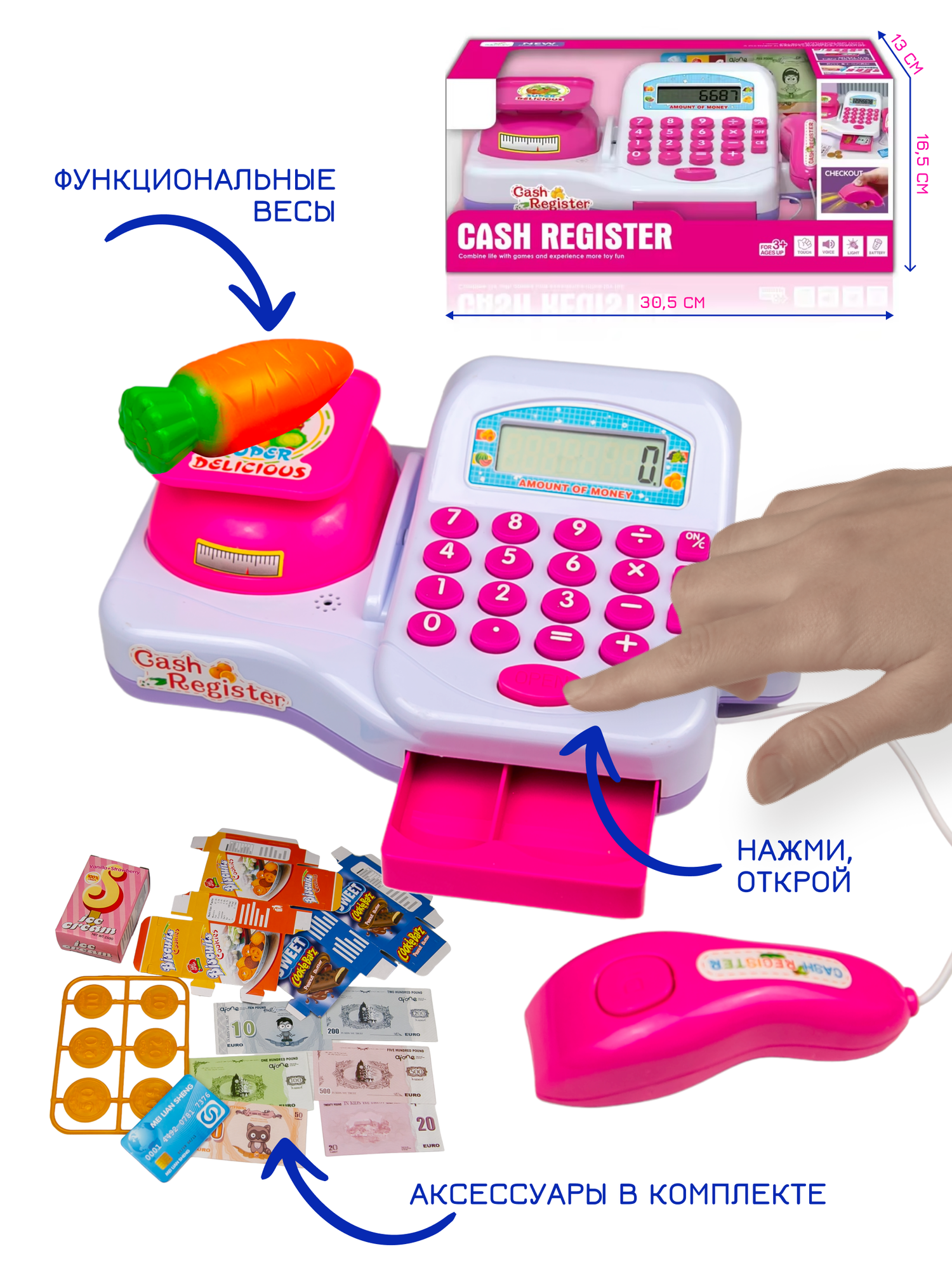 Детская игрушка касса - калькулятор игрушечная с деньгами и аксессуарами, со звуком и светом информация: