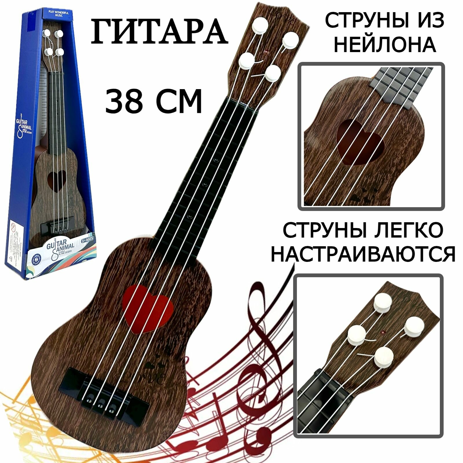 Детский музыкальный инструмент гитара, Укулеле, 4 струны, 38 см информация: