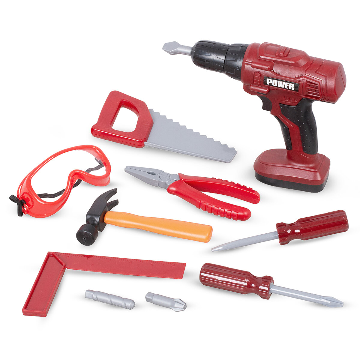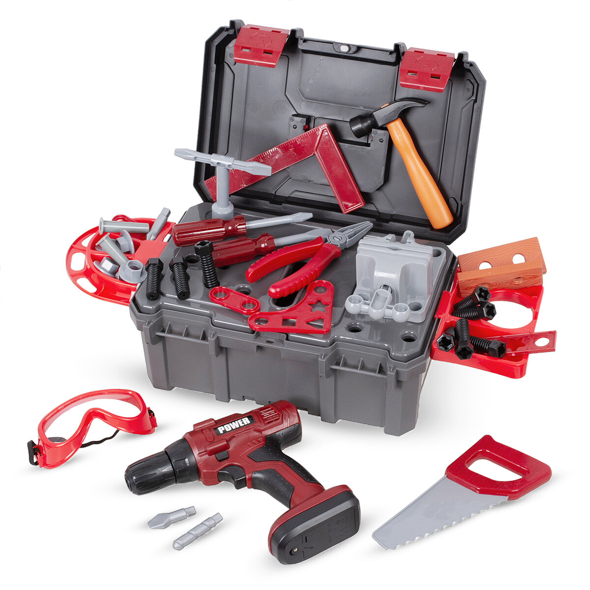 | Комплектация | Шуруповерт, молоток, пила, защитные очки, 8 болтов, 4 гайки, 4 детали с отверстиями, 2 дощечки с отверстиями, 2 отвертки, кусачки, строительный угольник, тиски, чемодан. |