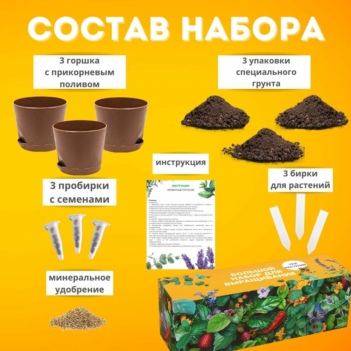 | Комплектация | Инструкция; горшочек объемом 0,4 л с системой прикорневого полива - 3 шт.; семена; грунт |