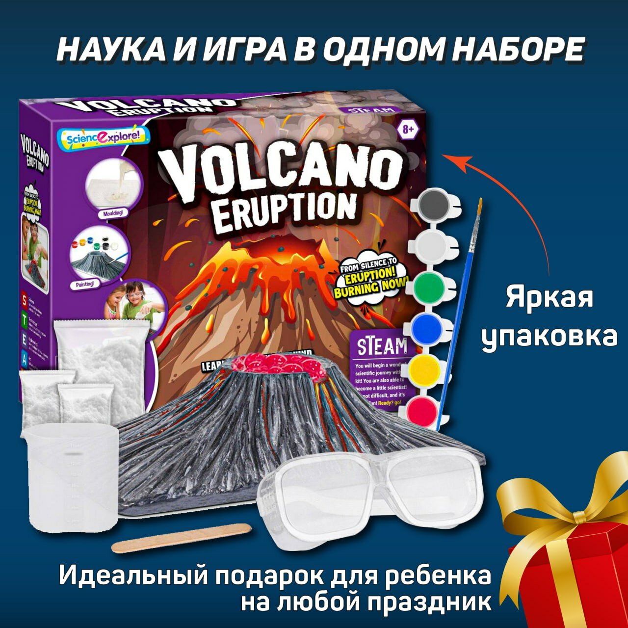 | Комплектация | вулкан из гипса- 1 шт, краски-6 цветов, кисточка- 1 шт, палочка для смешивания- 1 шт, порошки для создания лавы- 3 шт |