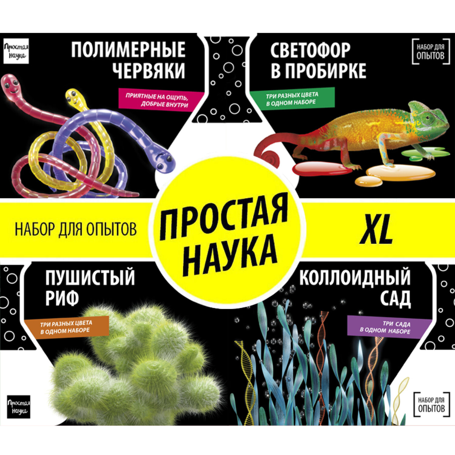 Набор для опытов для детей 4 в 1 Простая наука XL Premium состав: Пушистый риф, Полимерные червяки, Светофор в пробирке, Коллоидный сад информация: