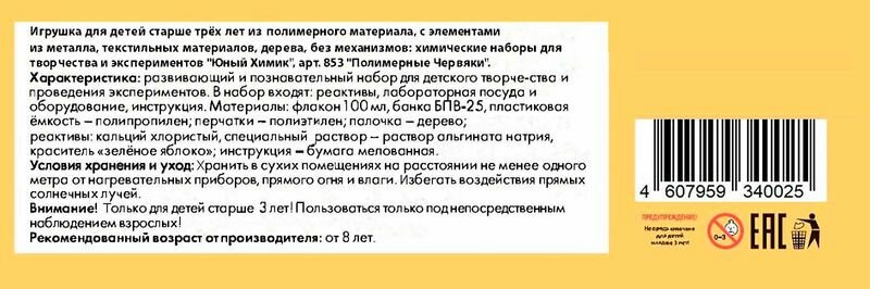 Набор для экспериментов INTELLECTICO "Юный химик.Полимерные червяки" 853 информация: