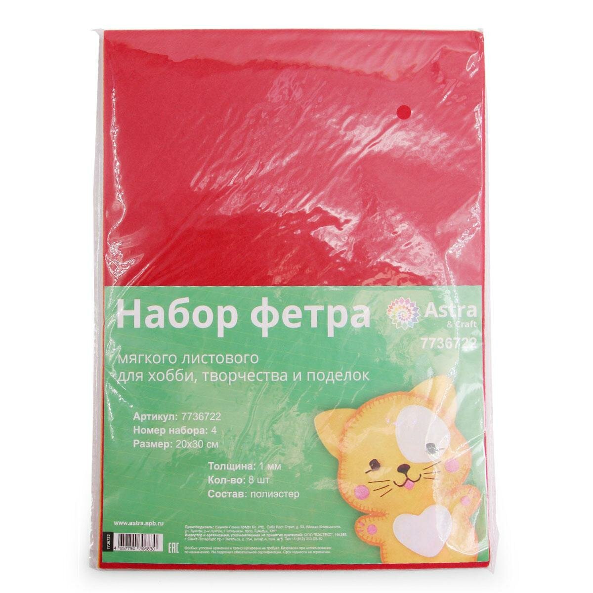 Фетр Astra&Craft Листовой мягкий, ассорти, №4, 1 мм, 170 г, 20х30 см, 8 шт информация: