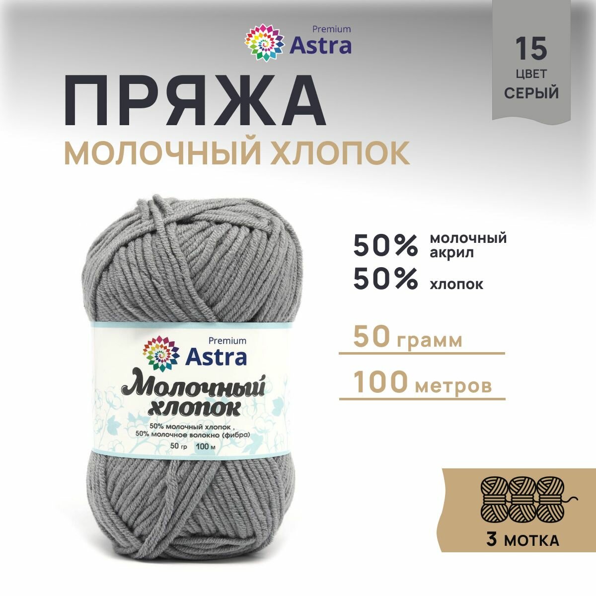 Пряжа для вязания Astra Premium 'Молочный хлопок' (Milk Cotton) 50гр 100м (+/-5%) (50% хлопок, 50% молочный акрил) (15 серый), 3 мотка информация: