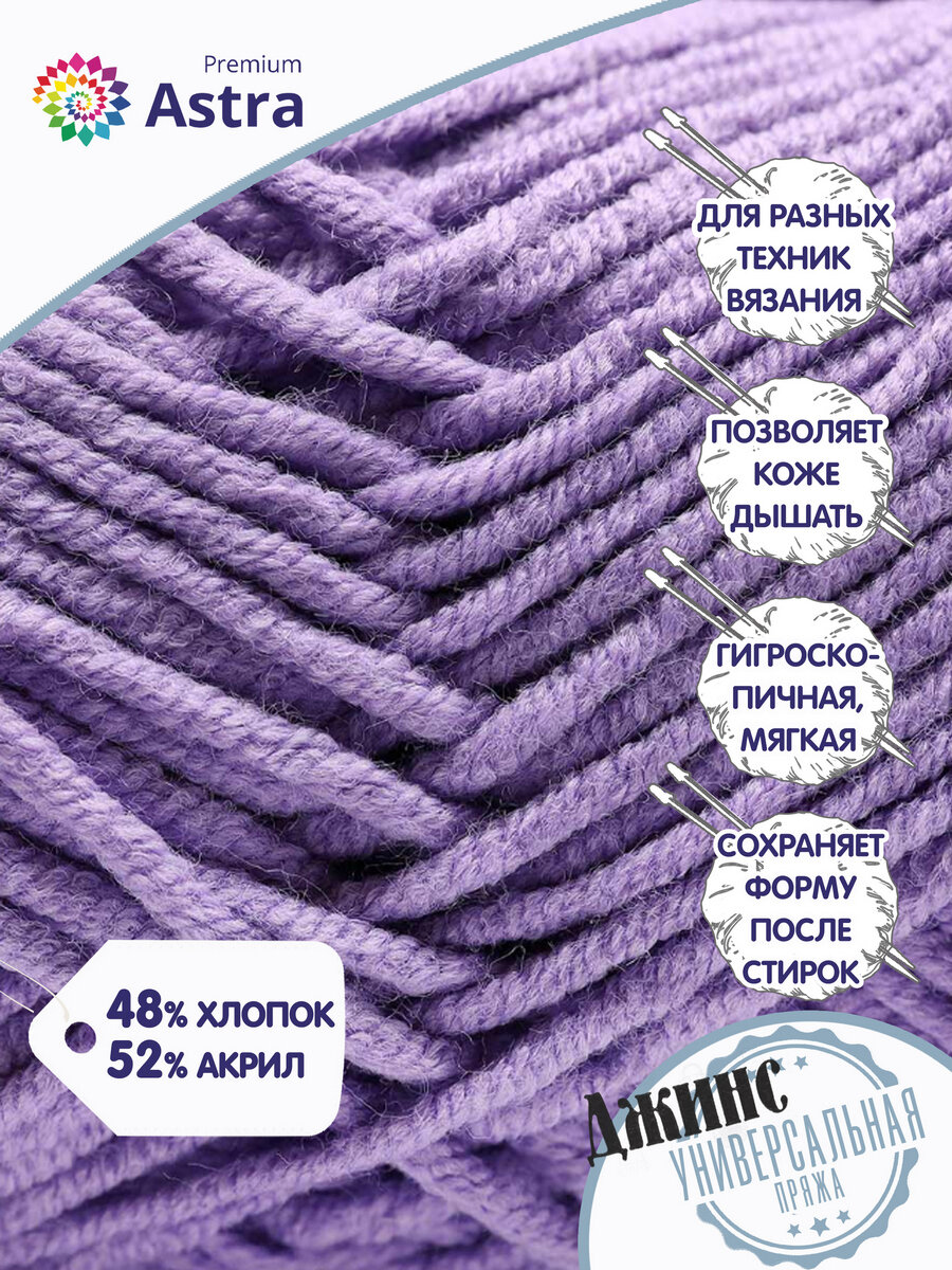 Пряжа Astra Premium "Джинс", 50 гр 135 м, 48% хлопок, 52% акрил, 750 фиолетовый, 4 шт информация: