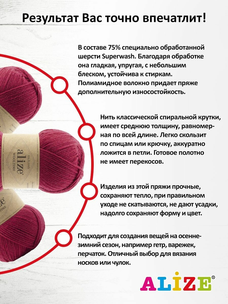 Пряжа для вязания ALIZE 'Wooltime', 100г, 200м (75% SW шерсть, 25% полиамид) (740 малина), 5 мотков информация: