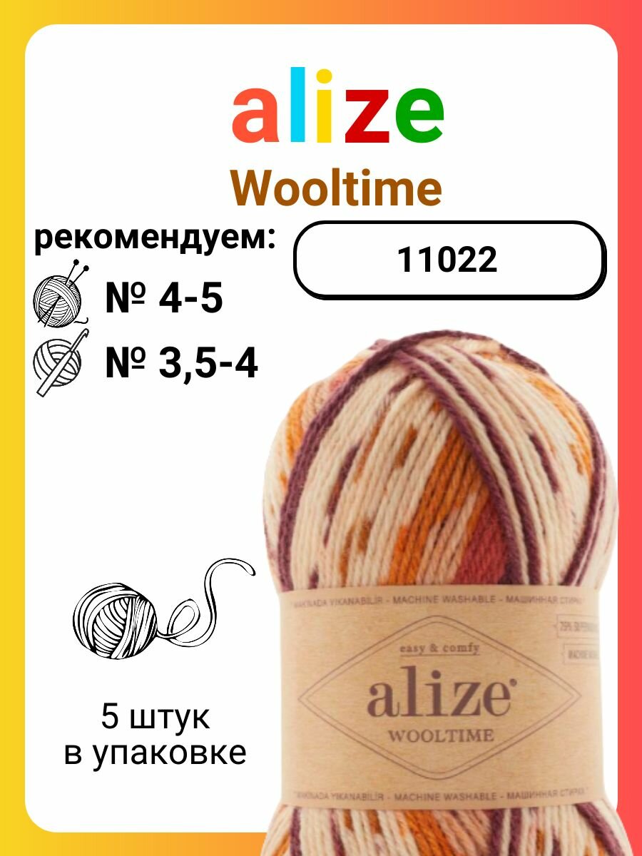 Пряжа Wooltime, Alize, принт - 11018, 75% SW шерсть, 25% полиамид, 5 мотков, 100 г., 200 м. 2 354 ₽