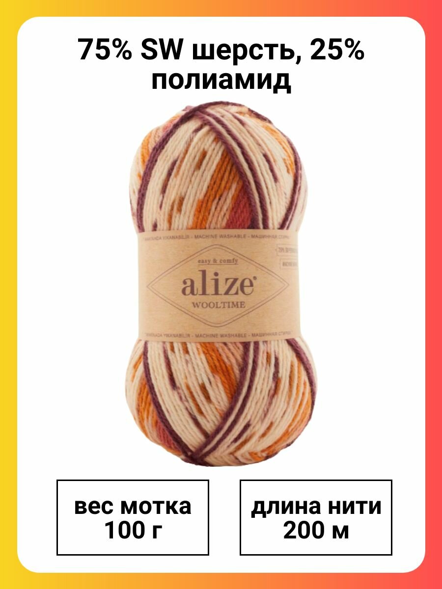 Пряжа Alize Wooltime (Вултайм) - 1 моток Цвет: 11014 оранжевый принт 75% шерсть, 25% полиамид, 100г 200м
