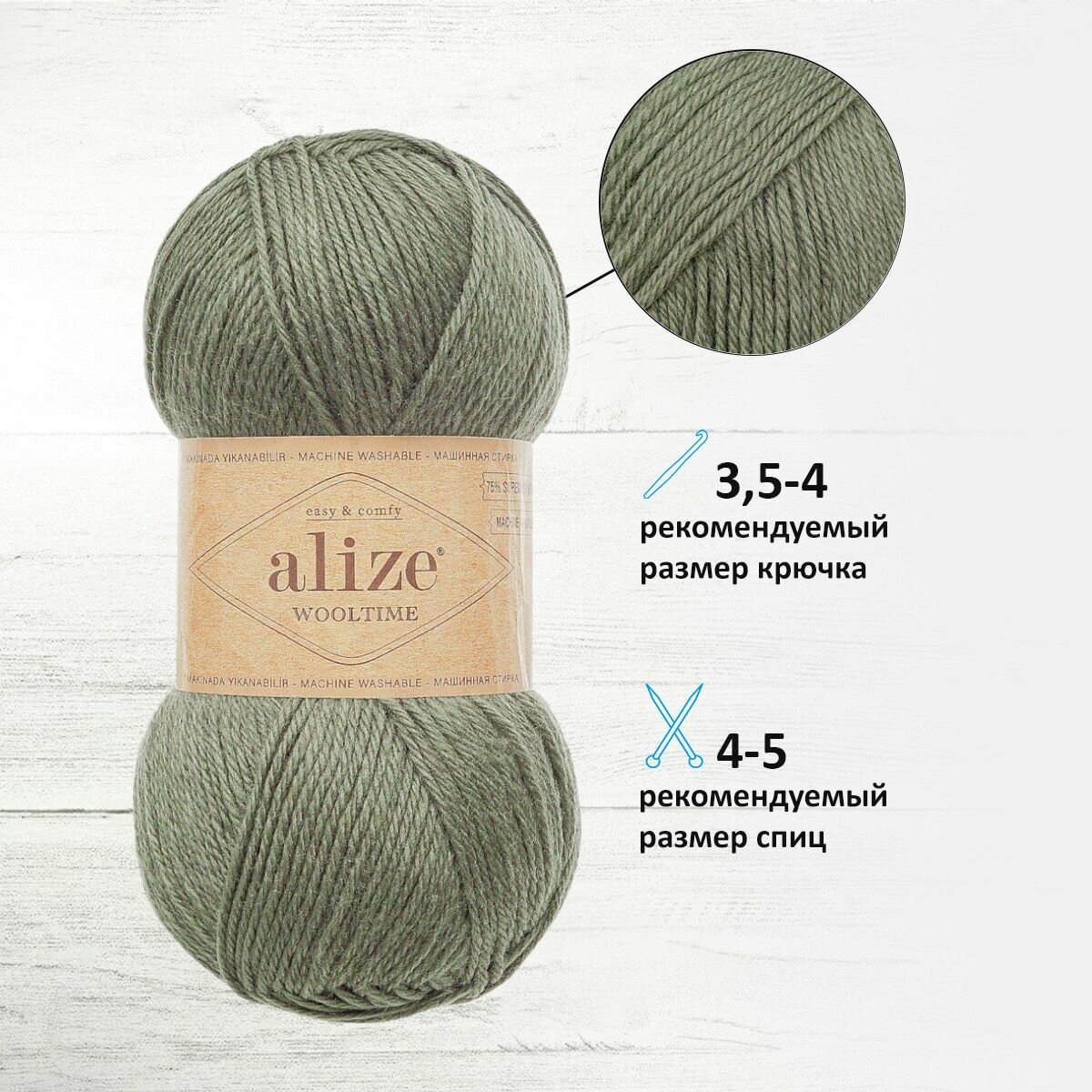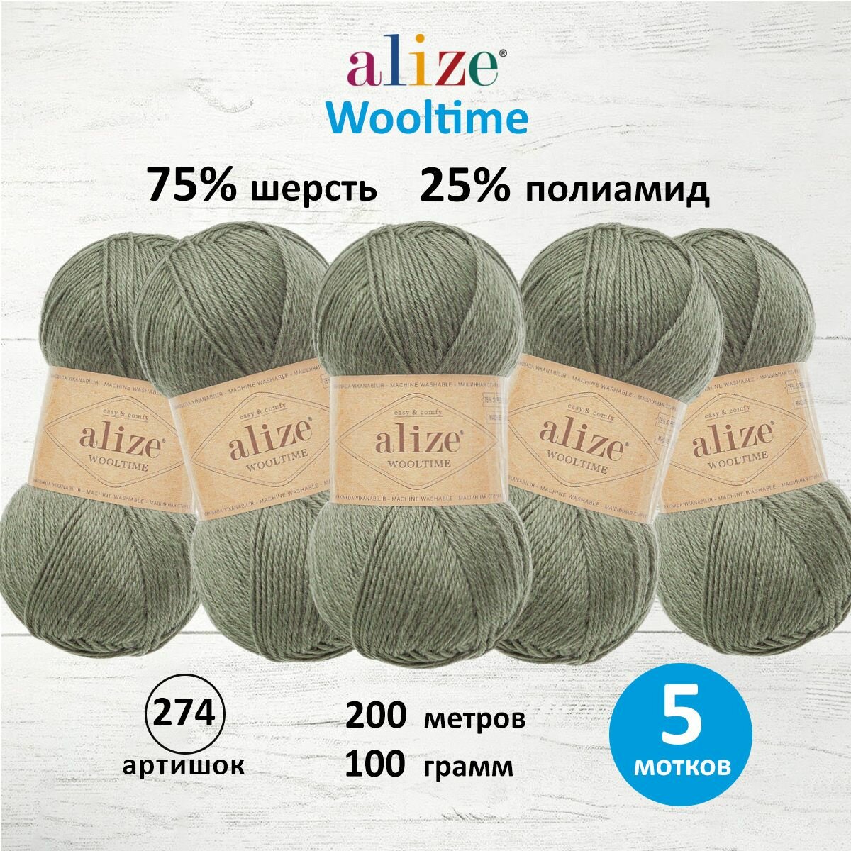 Пряжа для вязания ALIZE 'Wooltime', 100г, 200м (75% SW шерсть, 25% полиамид) (274 артишок), 5 мотков информация: