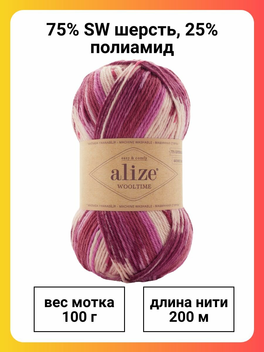 Пряжа Wooltime, Alize, принт - 11018, 75% SW шерсть, 25% полиамид, 5 мотков, 100 г., 200 м. 2 354 ₽