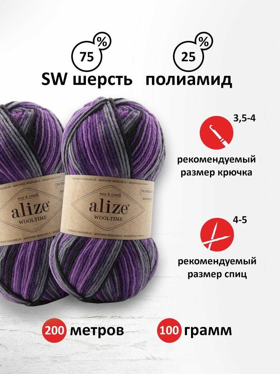 Пряжа Alize Wooltime принт черный-серый-сиреневый (11013), 75%шерсть/25%полиамид, 200м, 100г, 5шт 1 493 ₽