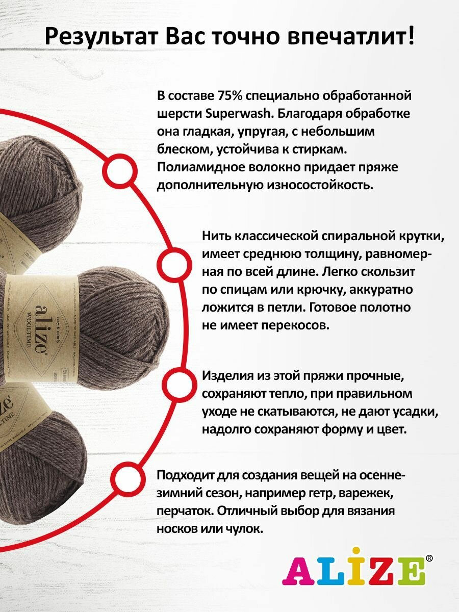 Отзывы на Пряжа для вязания ALIZE 'Wooltime', 100г, 200м (75% SW шерсть, 25% полиамид) (240 какао), 5 мотков