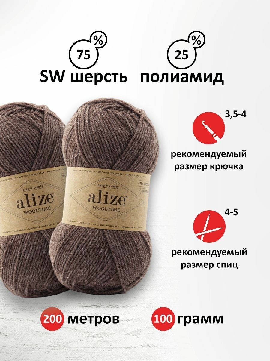 Пряжа для вязания ALIZE 'Wooltime', 100г, 200м (75% SW шерсть, 25% полиамид) (240 какао), 5 мотков информация: