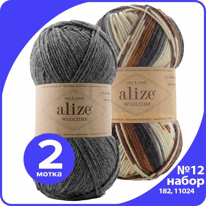 10 цен на Пряжа Alize Wooltime (Ализе Вултайм) - набор № 12 (182, 11024), 100 г / 200 м (75% шерсть, 25% полиамид) - 2 шт