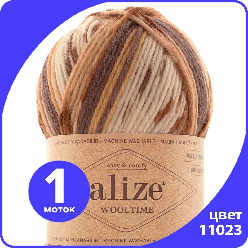 Пряжа Wooltime, Alize, бел/беж/корич - 11023, 75% SW шерсть, 25% полиамид, 5 мотков, 100 г., 200 м. 2 071 ₽