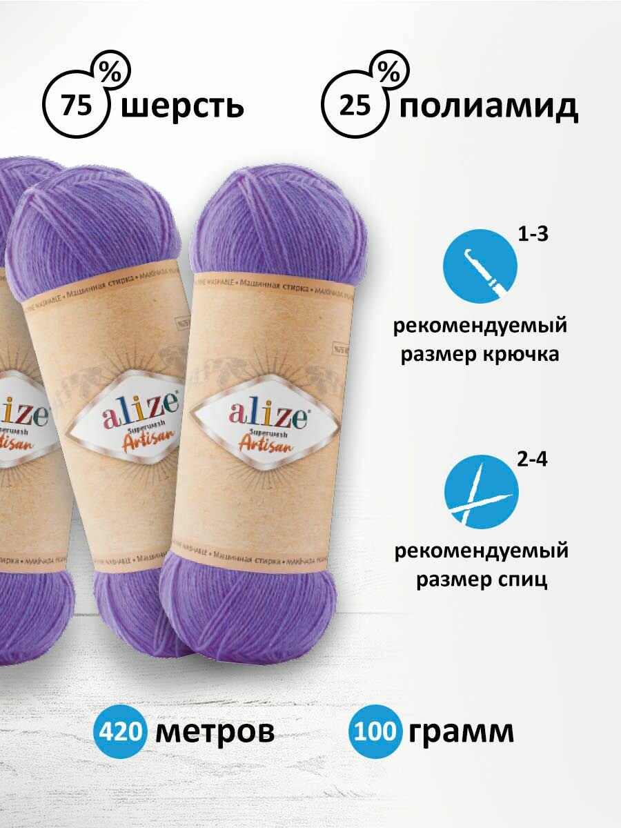 Пряжа Alize Superwash Artisan (Супервош Артисан) - 3 мотка, Плющ (873), 25% полиамид, 75% шерсть супервош, 420м/100г 1 040 ₽