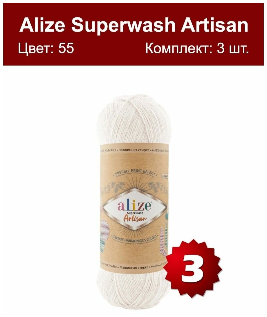 Пряжа Alize Superwash Artisan (Ализе Супервош Артизан) - 3 мотка, Белый (55), 75% шерсть супервош, 25% полиамид, 420м/100г