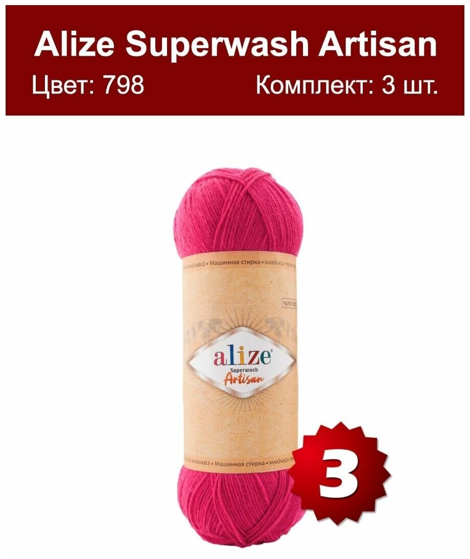 10 цен на Пряжа Alize Superwash Artisan фуксия (798), 75%шерсть/25%полиамид, 420м, 100г, 3шт