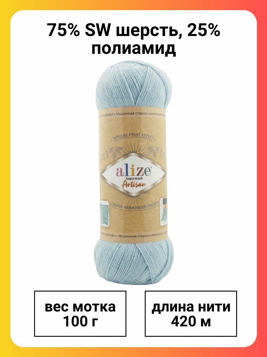 Пряжа Alize Superwash Artisan (Супервош Артисан) - 2 мотка, Светло-голубой (51), 25% полиамид, 75% шерсть супервош, 420м/100г 749 ₽