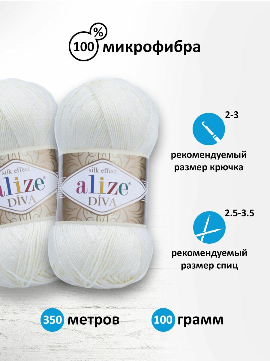 Пряжа ALIZE "Diva", 100 гр 350 м, 100% микрофибра, ТУ 62 молочный, 5 шт
