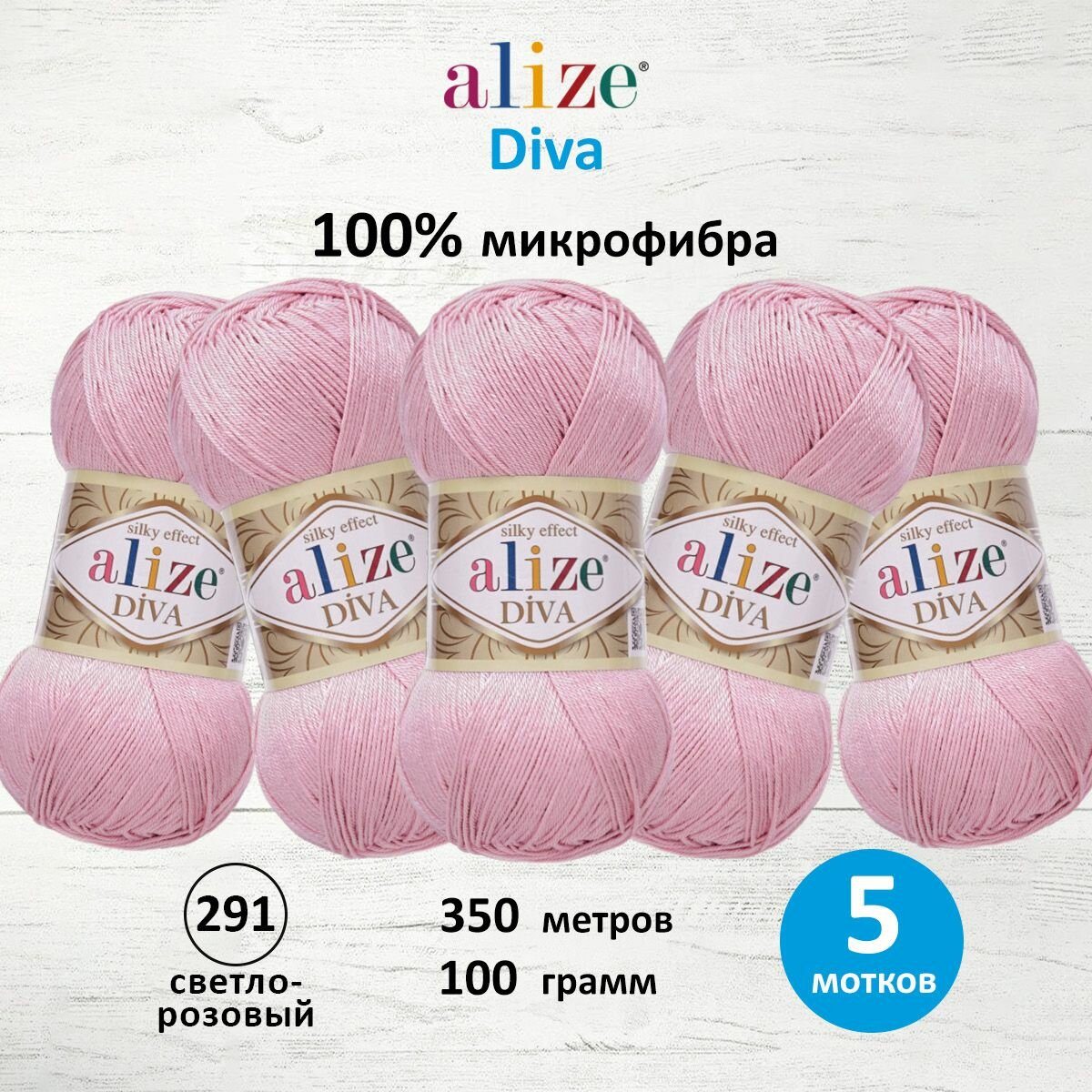 Пряжа ALIZE DIVA, светло-розовый - 291, 100% микрофибра акрил, 5 мотков, 100 г., 350 м. информация: