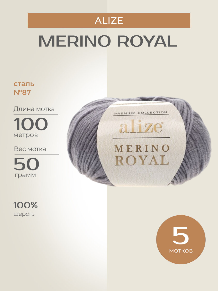 10 цен на Пряжа Alize Merino royal темно-серый (87), 100%шерсть, 100м, 50г, 5шт