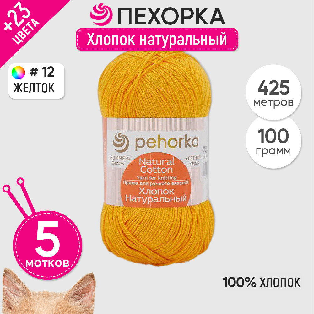 10 цен на Пряжа Хлопок натуральный 425м (Пехорка), Желток - 12, 100% хлопок, 5 мотков, 100 г., 425 м.