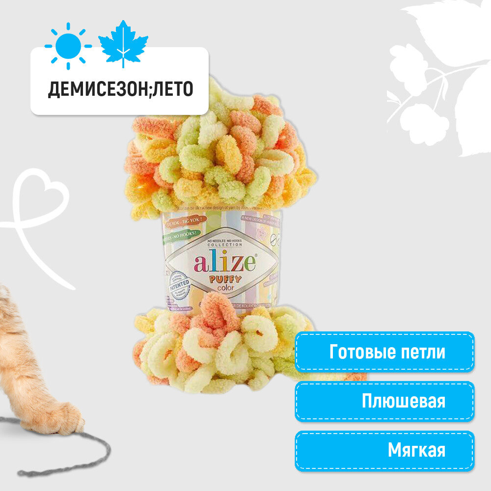 10 цен на Пряжа Alize Puffy color желтый-салатовый-коралловый (6313), 100%микрополиэстер, 9м, 100г, 5шт