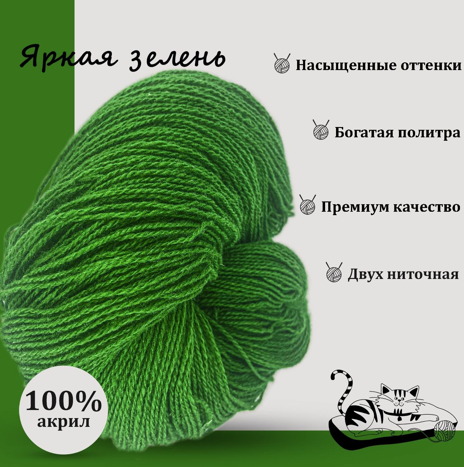 10 цен на Карачаевская пряжа мягкая в пасмах нитки 100 % акрил для вязания 600-650м/250-280гр, Яркая зелень