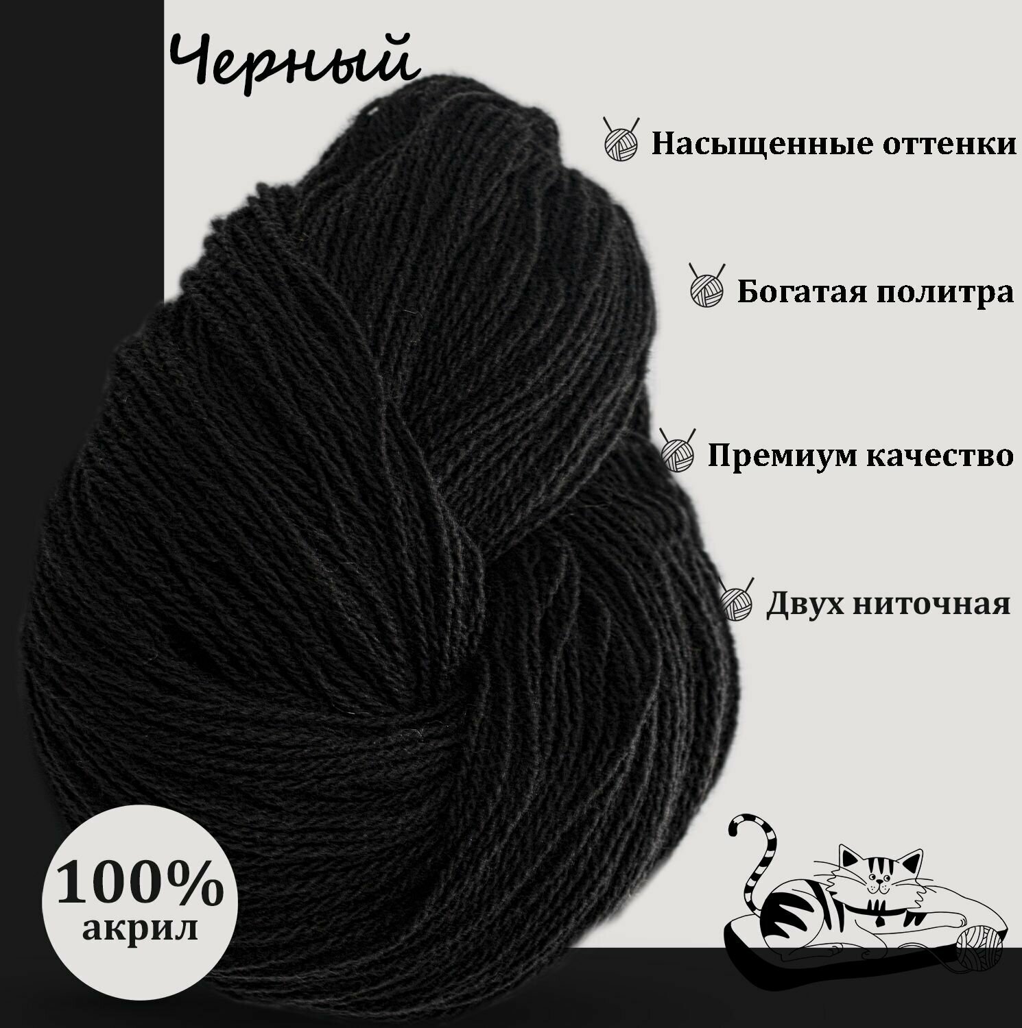 Карачаевская пряжа мягкая в пасмах нитки 100 % акрил для вязания 600-650м/250-280гр, Черный информация: