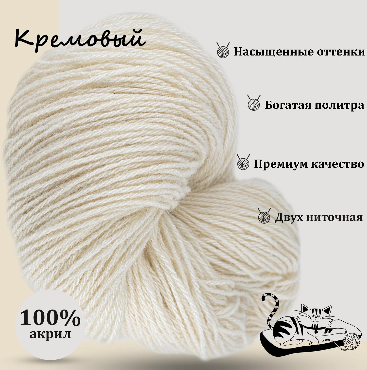 Карачаевская пряжа мягкая в пасмах нитки 100 % акрил для вязания 600 - 650м/250-280гр, Кремовый информация:
