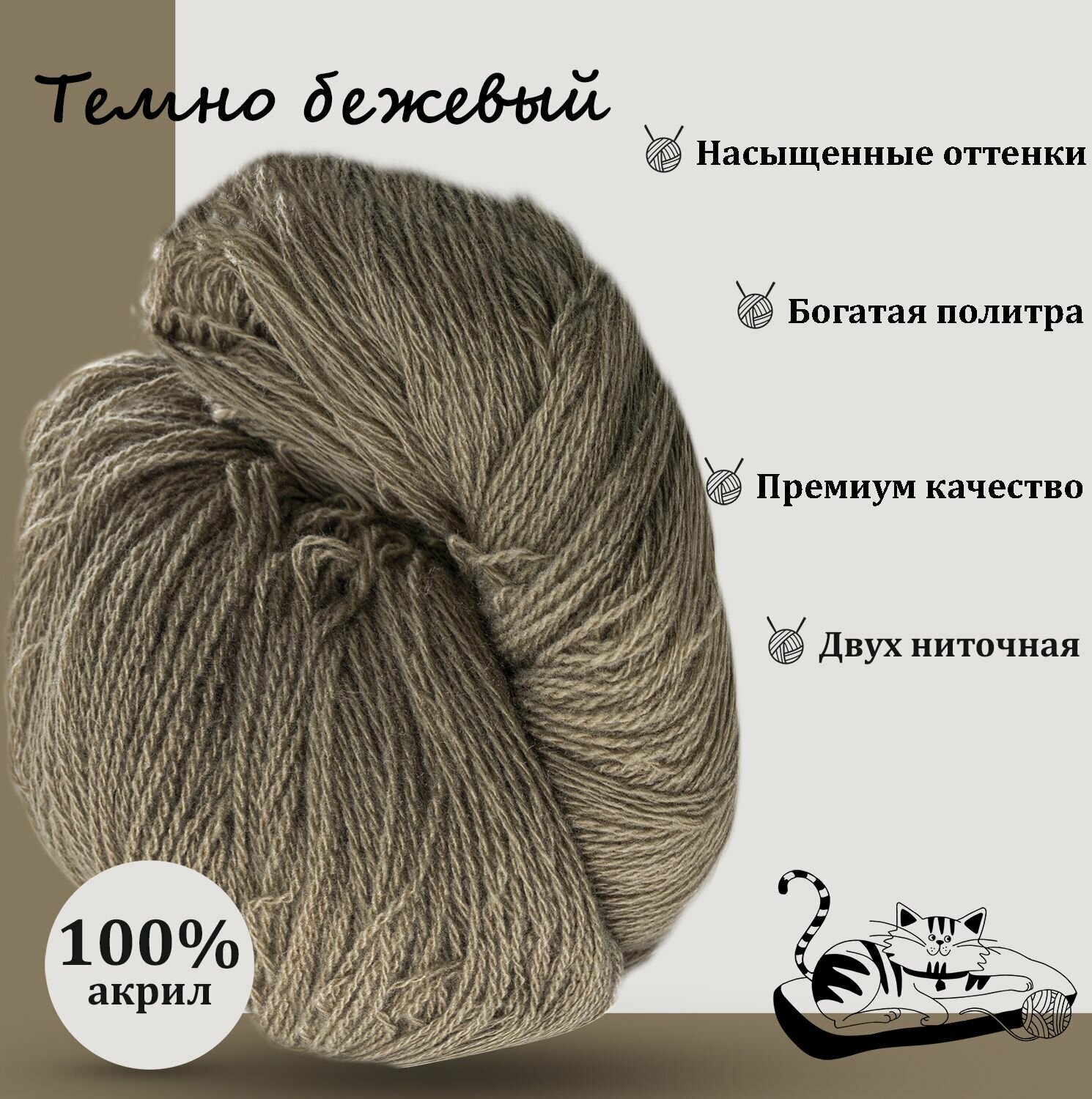 Карачаевская пряжа мягкая в пасмах нитки 100 % акрил для вязания 600-650м/250-280гр, Тёмно - Бежевый информация: